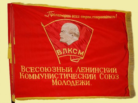 Красное знамя комсомольской организации представляло собой полотнище, на лицевой стороне в верхнем правом углу надпись: "Пролетарии всех стран, соединяйтесь!", в центре золотистыми буквами в три строки: "Всесоюзный Ленинский Коммунистический Союз Молодёжи".